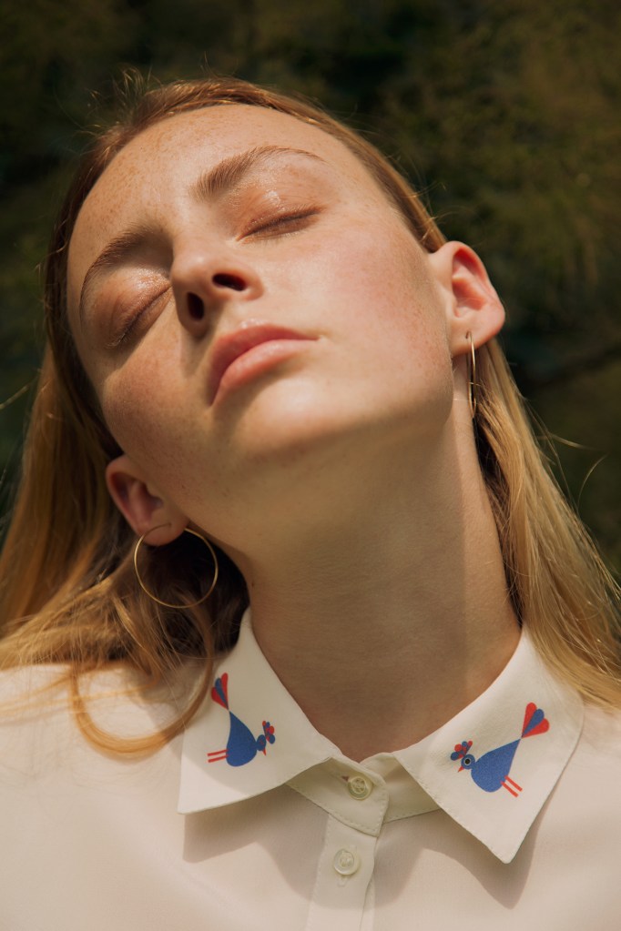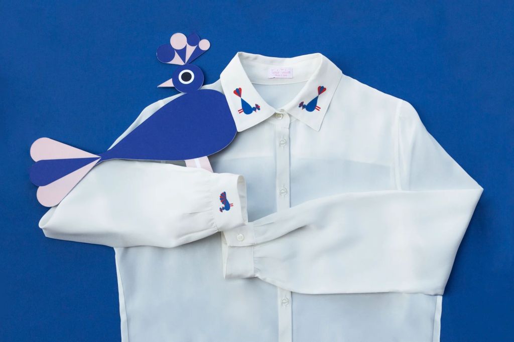 Babette, il pavone bluette, ti sta col fiato sul collo, anzi sul colletto… ed è un pavone di polso, anzi di polsino! Babette, il pavone bluette disegnato da Philip Giordano fa capolino sul colletto e sui polsini della camicia in seta bianca di Tarte Tatin.